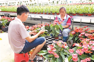 在位于谢岗镇农业园区的东实花卉种植示范基地内,只见一盆盆红掌分外娇艳,工人们穿梭其间,擦拭、装盆、包装……数千盆艳丽的红掌将会装车送往广州、深圳等地的花卉市场。