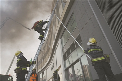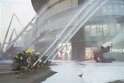 随后,48米举高喷射车以及高倍数泡沫排烟消防车对外围着火部位进行全物理覆盖。灭火无人机很快也加入了“战斗”,通过喷射泡沫灭火,有效控制外立面火势蔓延;高倍数泡沫排烟消防车则从地面发起“攻势”,以每小时80万立方米的正压送风,实现排烟、送风、降温等功能。最终,熊熊大火被完全扑灭。
