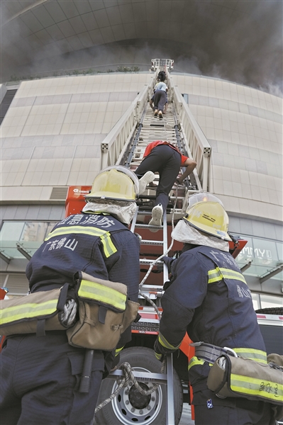 消防人员爬梯进行营救。