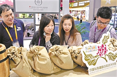 观众在进博会食品及农产品展区参观首次亮相中国的洪都拉斯咖啡豆。 新华社发