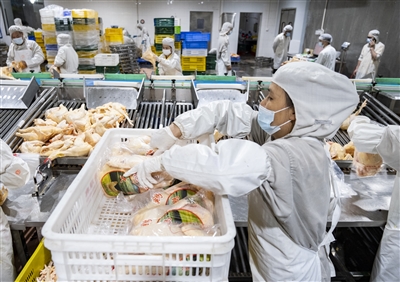 生产线工人正在分拣、打包黄鸡。