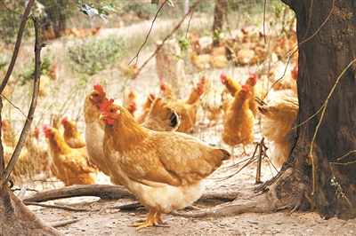 在养殖基地里,黄鸡三五成群地漫步觅食。