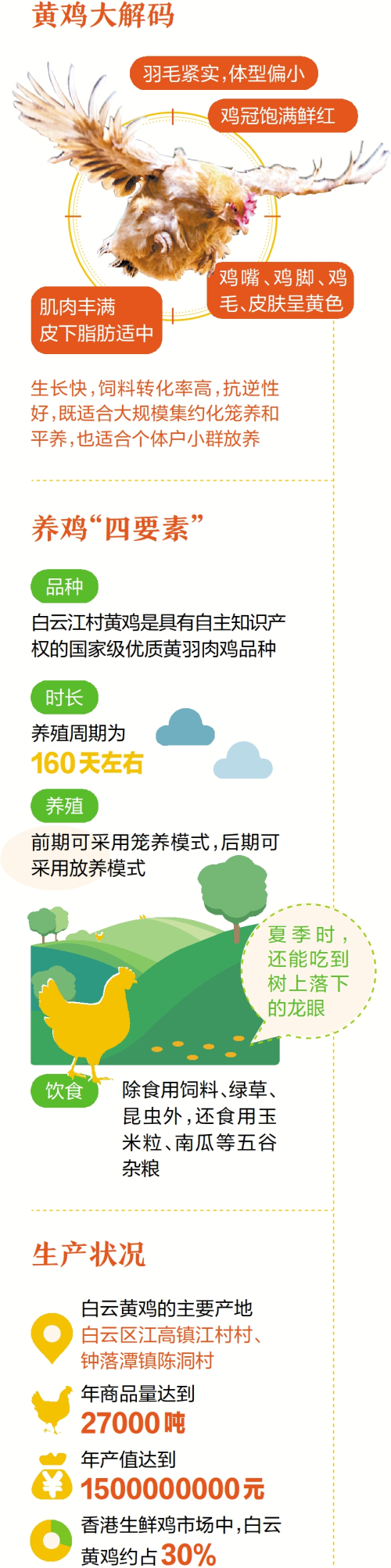 “无鸡不成宴”,鸡是很多粤菜餐桌上必不可少的主角。来自广州白云的黄鸡凭借肉质细嫩、鸡味鲜美等特色,获评全国名特优新农产品、中国名鸡等称号,深受大众喜爱,供应生鲜鸡规模大约占了香港市场的三成。记者深入探访了解到,从育苗到养殖,再到加工、运输,白云黄鸡逐渐形成了产业链、研发链,实现黄鸡产品就地加工升值,促进产业转型升级,年产值达到15亿元。科技助力建起国家级育种场、约20小时送抵香港市民餐桌、研发出40多种黄鸡预制菜品……一只黄鸡,为当地推进“百千万工程”、以特色农业激发乡村振兴活力带来了新机遇。