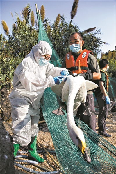 在位于园区中央的三大湖疫苗接种现场,工作人员准备穿起防护服的时候,湖面还是一片平静,鸟儿们优哉游哉地享受着午后和煦的阳光。不多久,湖面上出现了几艘小船,步调一致地把禽鸟往湖的西南侧赶。工作人员要对包括丹顶鹤、白枕鹤、火烈鸟、鹈鹕、黑颈天鹅、大天鹅、鸳鸯等珍禽在内的24种约370只禽鸟进行禽流感疫苗接种。只见保育员收网后,眼疾手快地抓住不停扑棱翅膀的禽鸟,兽医默契配合,迅速为捕捉的禽鸟注射疫苗。