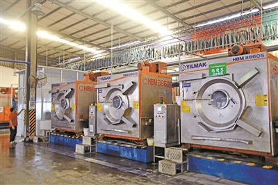 值得一提的是,洗水后的牛仔裤经脱水后并不是直接送进烘干机,而是通过传送带,利用烘干机产生的约四五十摄氏度废气余热进行烘干,最大限度地节省了能量消耗。