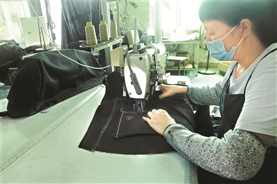 在制衣车间内,一件件裁剪好的牛仔裤布料悬挂在空中,沿着设定好的路线依次经过数十个不同车衣岗位,有人缝口袋、有人缝腰线,工人按照分工完成各自的工序,共同完成一条牛仔裤的加工制作。“从一块块小的裁片缝合成一条完整的裤子,一条牛仔裤经过20多个工序才能完成,一条裤子走完这些工序最快要约2小时。”广州广嘉服装有限公司总经理王永伦说。
