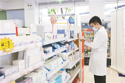 连锁药店内,工作人员检查货架商品。
