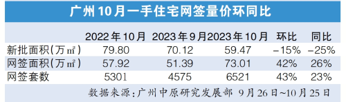 供求关系的变化值得关注。数据显示,10月份广州新批供应量为59.74万平方米,而网签面积则为73.01万平方米,相较之下,9月份的供需数字分别为70.12万平方米及51.39万平方米,去年同期的供需规模也与之相类似。这意味着,10月份一手市场整体供小于求,若这一势头可持续,一手楼市库存将随之下降。