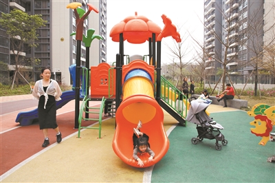 平西安置区,家长带着孩子在楼下的儿童游乐场玩耍。