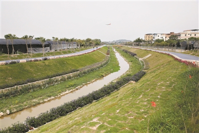 在白云国际机场三期扩建工程东北角,一条水道已经成形,两岸花红草绿。这里是机场三期北部排渠工程所在。这条水道好比“护城河”,让机场周边排渠的排涝能力大大提高。