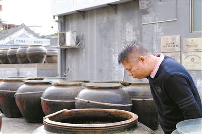如今,从挑选黄豆、浸豆、蒸豆,到加面粉入缸发酵、封缸,再到露天生晒、抽油/淋浇、观察色泽等12道工序,都遵循传承下来的古法人工制作,生产周期长达半年。“通常需要约100至120个晴天的生晒,露天生晒就得看天吃饭,温度、阳光等因素都有影响。”刘庆堂一边介绍一边揭开瓦缸查看酱油的色泽。在他看来,坚持露天生晒虽然费时费力,但也是自家酱油保持独特风味的最大奥秘所在。