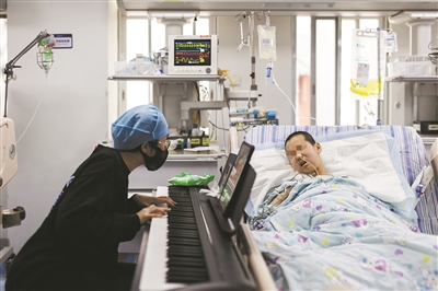 音乐治疗师正在为患儿弹奏其喜爱的歌曲。
