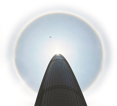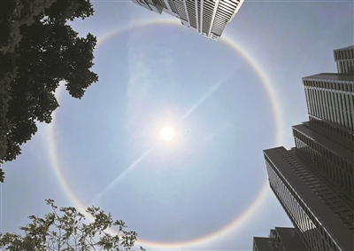 在感叹美景的同时,也有不少人会疑问:为何会出现日晕?记者从深圳市气象台获悉,日晕,又叫圆虹,一种大气光学现象,是日光通过卷层云时,受到冰晶的折射或反射而形成的,在太阳的周围能看到一圈明显的光圈,日晕的颜色顺序是从内向外依次是红、橙、黄、绿、蓝、靛、紫。