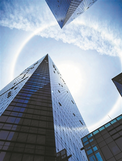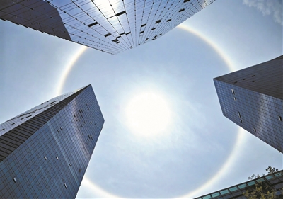 据悉,日晕现象一般出现在春夏季节。虽然少见,但并非奇异现象。专家解释,这是由于在5000米到6000米的高空中,出现了由冰晶构成的卷层云,云层中冰晶含量越大,阳光产生折射后,所呈现的“日晕”形状就会越小,光环也就越显著,更容易让人观察到。反之则无法形成“日晕”,或者即使形成也无法清楚地让人眼观测到。