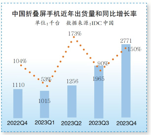 去年以来,保持高增长的折叠屏手机成为手机厂商“攻城略地”的焦点。国际数据公司IDC相关报告显示,2023年全年中国折叠屏手机市场出货量约700.7万台,同比增长114.5%,而自2019年首款产品上市以来,中国折叠屏手机市场连续4年同比增速超过100%。
