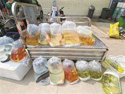 芳村花鸟鱼虫新世界附近的雀鸟区外,不少档主把一袋袋充好氧、装着观赏鱼的透明塑料袋放在街边摆卖。