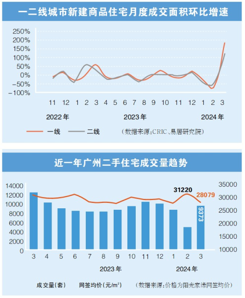 刚过去的这个小阳春究竟成色如何,对此业内看法并不统一。二手房方面,根据广州市房地产中介协会数据显示,3月二手住宅整体(中介促成+自行交易)网签宗数、面积分别为9373宗和93.46万平方米,环比上升均超过9成。广州市房地产中介协会表示,这主要获益于春节假期前积压的购房需求逐步释放,叠加此前广州放开限购区内120平方米以上户型,市场活跃度明显提升,从而驱动了3月二手房网签量大幅增长。