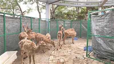 昨日10时许,记者来到佛山新城滨江湿地公园看到,河水已经将梅花鹿所在的草坪淹没,10只梅花鹿已经被转移到安全位置。沿着面对着六松水上乐园左边的一条绿色小径走到拐弯处,能看到一处顶部为玻璃的休憩凉亭,10只梅花鹿就被临时安置在这里。一位在旁边打扫卫生的环卫阿姨告诉记者,这几天一直下暴雨,河水水位上涨,仙鹿岛随时可能发生水浸的情况,因而管理方在前日下午就将梅花鹿转移。