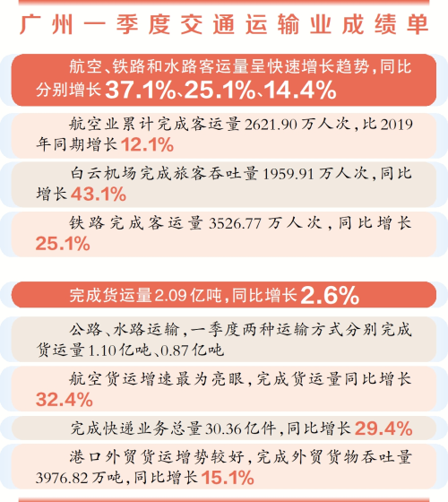 铁路旅客运输方面,广州充分发挥广州南站、白云站、东站等铁路网优势,加强春运和元旦小长假等客流高峰时段运输组织,持续提升旅客运输能力。一季度铁路完成客运量3526.77万人次,同比增长25.1%;其中,春运期间广州各铁路站点日均旅客发送量达41.95万人次。