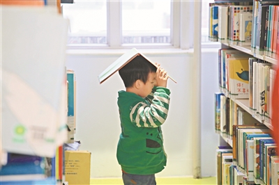 小朋友在书架旁选书。
