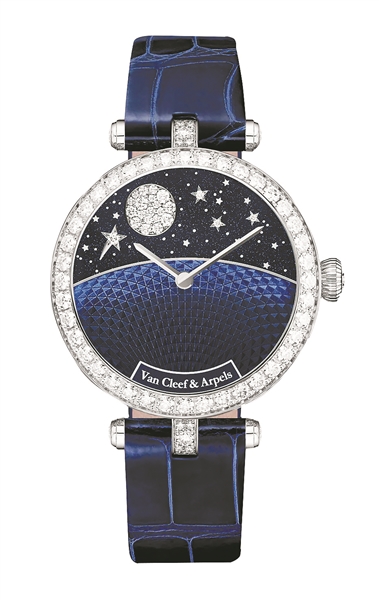 同样擅长在高级珠宝里展现腕表大师工艺的还有Van Cleef & Arpels梵克雅宝。怀抱对生命诗意盎然的想象,新一季里品牌将梦想与情感更深层次地融入制表艺术当中,比如重新演绎2008年面世的Jour Nuit腕表,其推出两枚分别为33毫米和38毫米的新作。密镶美钻的星月恒久追逐旭日的画卷定格于方寸表盘之上,雪花镶嵌黄色蓝宝石或玑镂雕花黄K金工艺为这一轮旭日镀上璀璨光芒。其中,砂金石玻璃经过精细的镂空处理,与一颗颗镶嵌钻石的白K金星星交相辉映,共同见证世家精湛绝伦的匠心工艺。