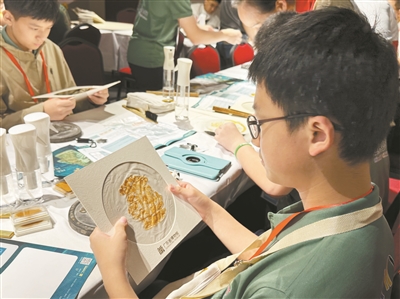 少年儿童体验青铜器纹饰拓印,领略奇妙的青铜器艺术。