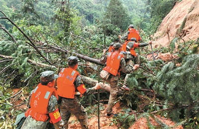 河边的公路坍塌了近50米,官兵只能绕道山林中继续前行,步行2分钟就能通过的路程,却不得不因道路塌方绕行10分钟。“大家把鞋带系紧一点,不然陷到泥里面拔不出来。”进山不到200米,侦察股长王闯就扯着嗓子喊道。只见塌方的泥土被雨水冲刷得像一团团“糨糊”,一脚踩下去就能没过大腿。