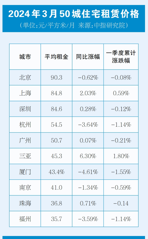 住房租赁市场正呈现蓬勃发展态势,一季度正经历了从淡转旺的过程。2024年一季度50城住宅平均租金累计下跌0.29%。分月度来看,1月、2月受春节假期影响,租房需求释放有所放缓,住房租赁市场处于传统淡季,租金环比保持下跌态势;3月,受节后人员返城、工作变动等因素带动,租房需求集中释放,住房租赁市场逐步进入旺季,3月50城住宅平均租金为36.5元/平方米/月,环比止跌转涨,同比仍下跌0.73%。