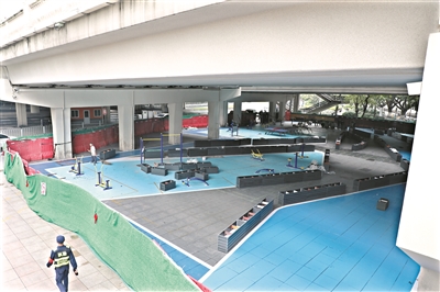 在走访中,记者看到滨江东路从广州大桥南侧桥底穿行而过,将桥底空间“分割”成南北两侧。在桥底北侧空间,如今正围蔽改造成一处市民娱乐运动的休闲场地,施工人员目前已经将场地内的乒乓球台、健身设施铺设完成,地面的颜色分为深蓝色与浅蓝色,将该区域分为若干块小的运动区域。在不同运动区域的周围,则摆放了由盆栽搭建的绿植围栏,不同区域之间都留出了行人通道。