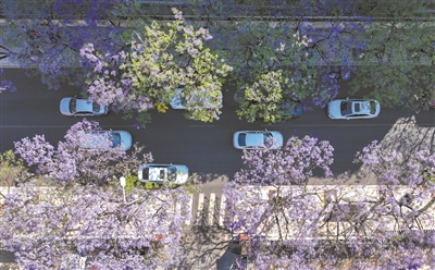 昆明市教场中路的蓝花楹绽放。