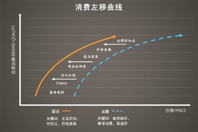无独有偶,被称为线上“奥莱”的唯品会,近一个月以来,童装销量同比猛增35%,男装、运动户外销量增长20%以上。以品牌折扣为核心的折扣零售正在拥抱黄金期。而这背后是社会消费观念的转变,“消费左移”悄然深入人心:如果把社会消费趋向看作是一个坐标轴,横坐标是价格,纵坐标是品质品牌,人们希望纵坐标品质品牌不变,横坐标价格向左移动减少。