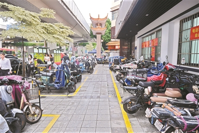 在三元里古庙附近牌坊、机场路电车站附近牌坊、万里汽配市场等多个村外集中停车点,记者看到大量电动车整齐停放在黄线划定区域内,秩序较新规实行首日大有改观。附近几家商铺店主也反映,“电单车乱停放堵门口”的现象基本不存在了。