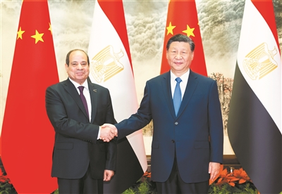 习近平指出,68年前,埃及在阿拉伯和非洲国家中率先同新中国建交。任凭国际形势风云变幻,两国始终相互信任、真诚合作、携手发展。今年是中埃建立全面战略伙伴关系10周年。10年来,我同塞西总统共同引领双边关系蓬勃发展。中埃关系已经成为中国同阿拉伯、非洲、伊斯兰和发展中国家团结协作、互利共赢的生动写照。新形势下,建设更具内涵、更有活力的中埃关系,符合两国人民共同期待。中方愿同埃方不断深化互信,推进合作,构建面向新时代的中埃命运共同体,为地区乃至世界和平、稳定、发展、繁荣贡献力量。