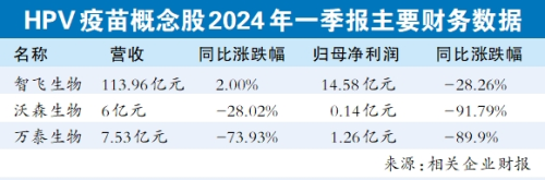 在“降价潮”袭来的同时,不少HPV疫苗企业今年以来业绩、利润承压。智飞生物(默沙东九价HPV疫苗国内代理)一季度营收为113.96亿元,同比增长2%;归母净利润却下滑至14.58亿元,同比下降28.26%;沃森生物一季度营收为6亿元,同比下降28.02%;归母净利润1412.75万元,降幅达91.79%;万泰生物一季度营收7.53亿元,同比下降73.93%;归母净利润也下降至1.26亿元,降幅达到89.9%。