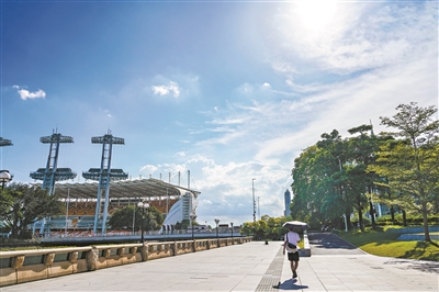 天气炎热,市民打着伞路过海心沙一带。广州日报全媒体记者吴子良 摄