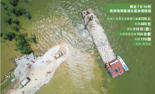记者在湖南华容县团洲垸洞庭湖大堤决堤现场了解到,自堤溃后,加固“第二道防线”的工作紧张进行。“第二道防线”是离决口不远处的钱团间堤,这是一道横亘在团洲垸和钱南垸之间、长约14.3公里的间堤,守护着隔壁钱南垸的十余万亩良田和百姓的家园。