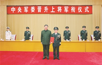 下午4时许,晋衔仪式在庄严的中华人民共和国国歌声中开始。中央军委副主席张又侠宣读了中央军委主席习近平签署的晋升上将军衔命令。中央军委副主席何卫东主持晋衔仪式。