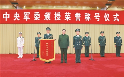 八一大楼仪式现场,部队官兵和文职人员代表整齐列队,气氛庄重热烈。下午3时30分许,18名礼兵正步入场,持枪伫立两侧,颁授仪式开始,全场高唱中华人民共和国国歌。中共中央政治局委员、中央军委副主席张又侠宣读习近平签署的中央军委授予荣誉称号命令,中共中央政治局委员、中央军委副主席何卫东主持仪式。
