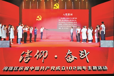 广州市海珠区机关党员干部走上舞台,通过合唱、情景表演等方式,以真情实感展示海珠区广大党员干部们在新时代新征程中,不忘初心,肩负新使命,开启新征程,做到心中有党、心中有民、心中有责、心中有戒,切实肩负起和践行好时代赋予的新使命(资料图片)。 广州日报全媒体记者骆昌威 通讯员海宣 摄