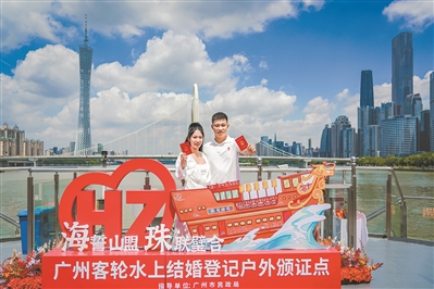 广州日报讯 (全媒体记者何钻莹 通讯员陈丽晶)珠水滔滔,会展码头鹅潭印象号游船之上,首对在此领证结婚的新人许下了爱的诺言。7月9日,由广州市民政局指导,广州市海珠区民政局、广东省婚庆行业协会与广州公交集团客轮公司携手,在鹅潭印象号游船上揭幕了广州客轮水上结婚登记户外颁证点,一对新人在游船上举行了领证仪式。