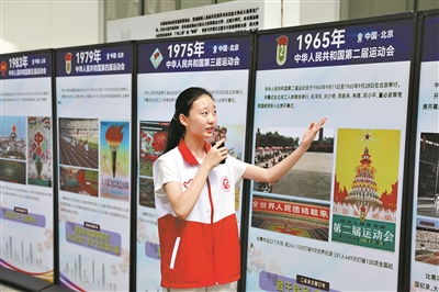 活动现场设置了“更高 更快 更强 全民 全心 全运”历届全运会主题展览及广州中小学生志愿服务精品项目展览。图为中学生志愿者正在全运会历届主题展览前讲解。