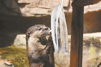 在水獭展区,饲养员一大早把日常工作完成后,忙碌着为亚洲小爪水獭准备了冰块,冰块里有鱼,清晰可见。冰块挂在室外栖架适合的高度上,小爪水獭立即迎过来把握“凉”机,后肢用力一蹬,身体站起来用前肢接触冰块,对“消暑神器”爱不释手,并吃着冰块里的鱼,一副“砸嘴舔唇”的样子。尽情地享受冰块带来的凉快。