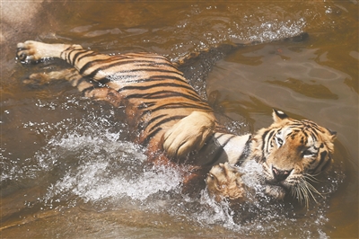在猛兽谷,高大的树木枝繁叶茂,成了老虎的“天然遮阳伞”,除了在树荫下乘凉,水池更是它们纳凉的好去处。它们在水中泡澡纳凉,自得其乐。