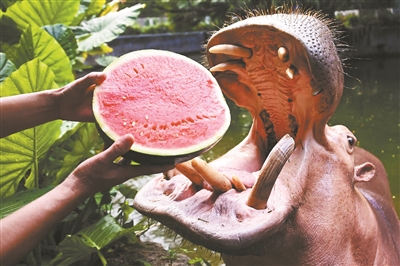 天气炎热,多汁清甜的西瓜是不少动物爱吃的消暑食物。饲养员把大半个西瓜放进河马大嘴里,河马“吧唧”合拢嘴巴,瓜汁瞬间从嘴边流出,津津有味地咀嚼,吃完嘴里的西瓜,河马余味无穷,还继续吃着掉落在地上的小块瓜瓤,仿佛争当动物界“光盘一族”。