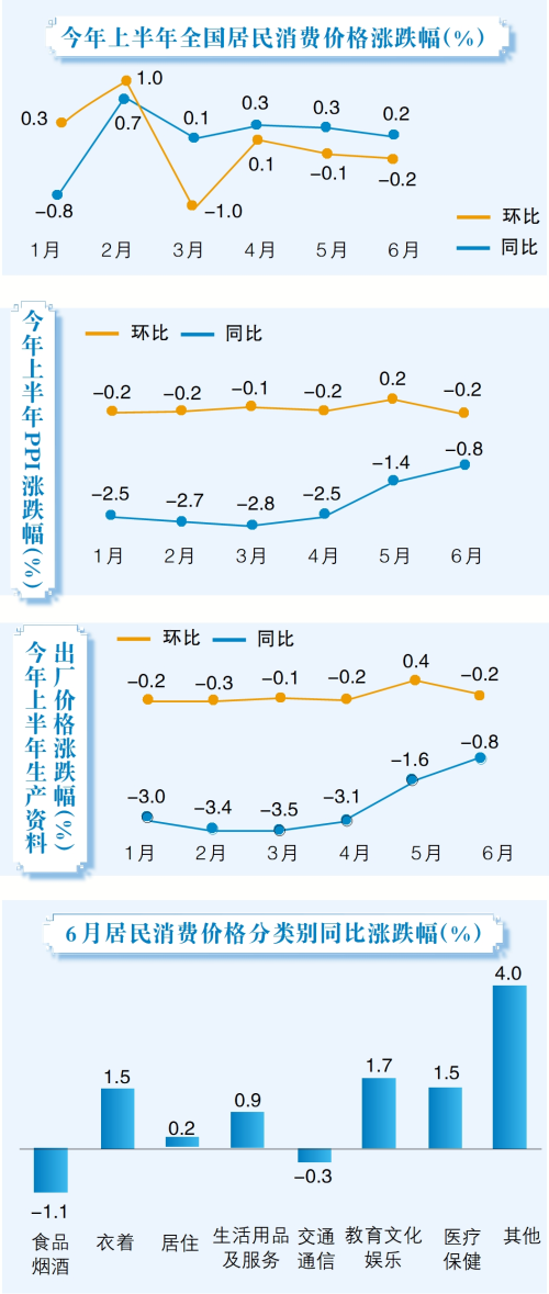 7月10日,国家统计局发布数据显示,6月份居民消费价格指数(CPI)环比季节性下降0.2%,同比上涨0.2%,连续5个月同比正增长;受国际大宗商品价格波动及国内部分工业品市场需求不足等因素影响,工业生产者出厂价格指数(PPI)环比下降0.2%,同比下降0.8%,降幅继续收窄。