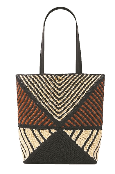 LOEWE的酒椰纤维PUZZLE FOLD手袋的设计灵感来自其经典手袋系列的几何线条,设计师运用不同线条和色彩的镶片诠释几何建筑美感。