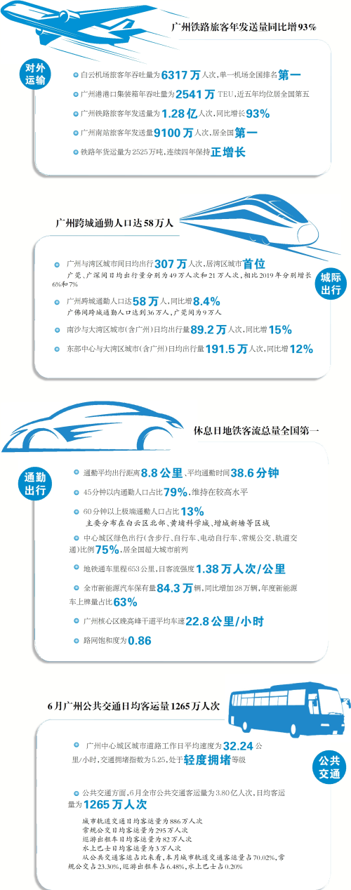 《报告》中透露,2023年,广州与湾区城市间日均出行307万人次,相比2019年增长6%;南沙、东部中心与湾区城市日均出行量同比增长15%和12%,对外辐射能力增强;全市平均通勤时间38.6分钟,相比2019年减少1.9分钟;中心城区绿色出行比例75%,居全国超大城市前列……