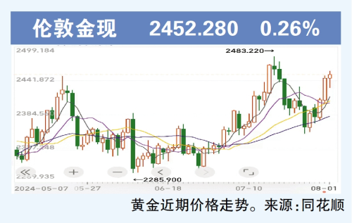 广州日报讯 (全媒体记者 许晓芳)8月1日亚市盘中,现货黄金一度逼近2460美元/盎司,随后金价短线回落,截至8月1日21时45分,现货黄金报价2452.28美元/盎司,本周累计上涨2.69%。