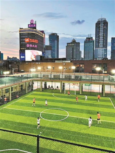 琶醍啤酒文化创意艺术中心二楼楼顶上的足球场,市民在夜色下运动锻炼。