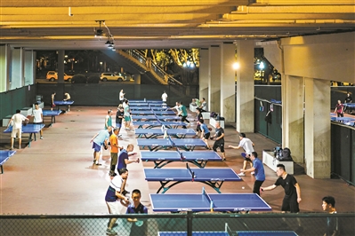 广州大桥北侧桥底的乒乓球场内,市民两两组队,挥拍比拼。